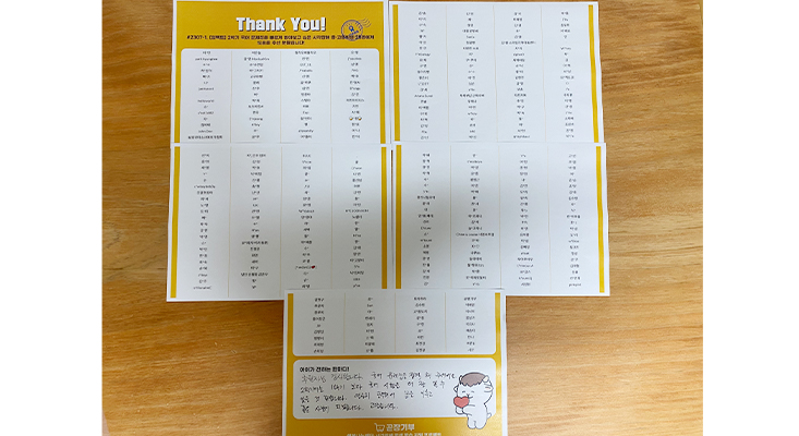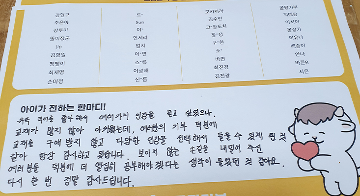 단원별로 제작되어 발송된 내용은 50% 진행과 100% 진행에 한번씩, 다 마무리되면 기부 후기를 알려드려요.