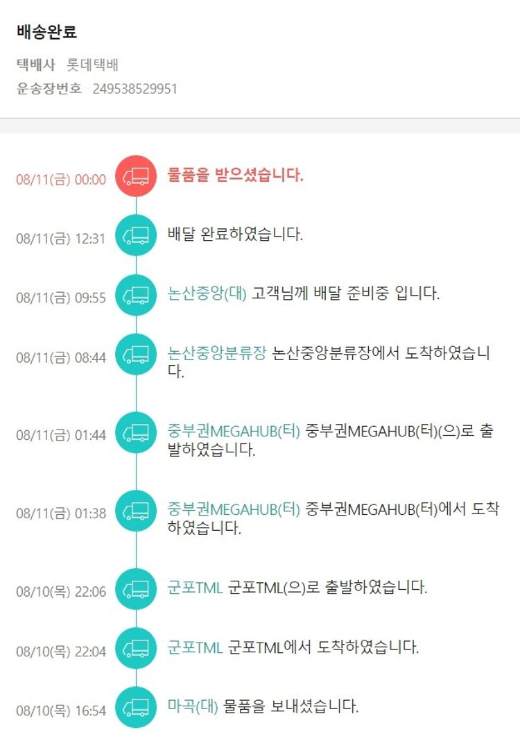 기부자님이 사용한 기부포인트 32,000원, 가격상승분 4,504원, 100원 미만 지원금 76원, 결제 수수료 21,751원, 기타 사업비는 행복나눔재단이 부담했습니다. (기부후기 발송시점에 최종 업데이트 됩니다.) 주문 건 중 품절 건 발생하여 2023. 08. 10. 재주문했습니다. 실제 쇼핑몰에서 확인되는 배송현황을 캡처한 내용입니다. 실시간 자료와는 차이가 있을 수 있습니다.