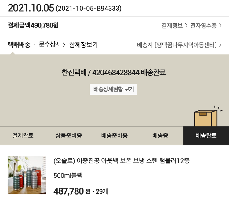 기부자님이 사용한 기부포인트 14,450원, 물품배송비 3,000원, 100원 미만 지원금 80원, 결제 수수료 7,261원, 기타 사업비는 행복나눔재단이 부담했습니다. (기부후기 발송시점에 최종 업데이트 됩니다.) 실제 쇼핑몰에서 확인되는 배송현황을 캡처한 내용입니다. 실시간 자료와는 차이가 있을 수 있습니다.