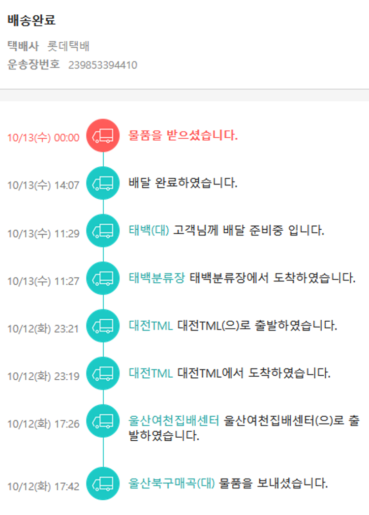 기부자님이 사용한 기부포인트 15,100원, 물품배송비 9,000원, 가격상승분 4,470원, 100원 미만 지원금 27원, 결제 수수료 12,323원, 기타 사업비는 행복나눔재단이 부담했습니다. (기부후기 발송시점에 최종 업데이트 됩니다.) 실제 쇼핑몰에서 확인되는 배송현황을 캡처한 내용입니다. 실시간 자료와는 차이가 있을 수 있습니다.