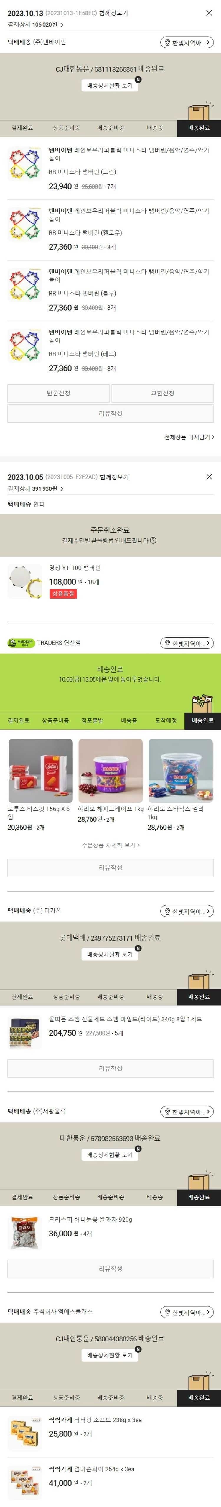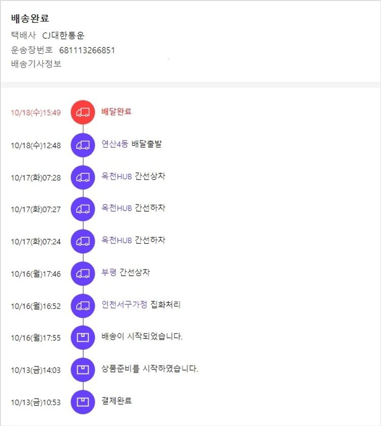 기부자님이 사용한 기부포인트 9,000원, 물품배송비 6,500원, 가격상승분 820원, 100원 미만 지원금 30원, 결제 수수료 13,460원, 기타 사업비는 행복나눔재단이 부담했습니다. (기부후기 발송시점에 최종 업데이트 됩니다.) 주문 건 중 품절 건 발생하여 2023. 10. 13. 재주문하였습니다. 기존 탬버린 품절로 인해 센터 선생님과 논의 후, 아동이 양손에 들고 연주할 수 있는 탬버린으로 대체 주문되었습니다. 실제 쇼핑몰에서 확인되는 배송현황을 캡처한 내용입니다. 실시간 자료와는 차이가 있을 수 있습니다.