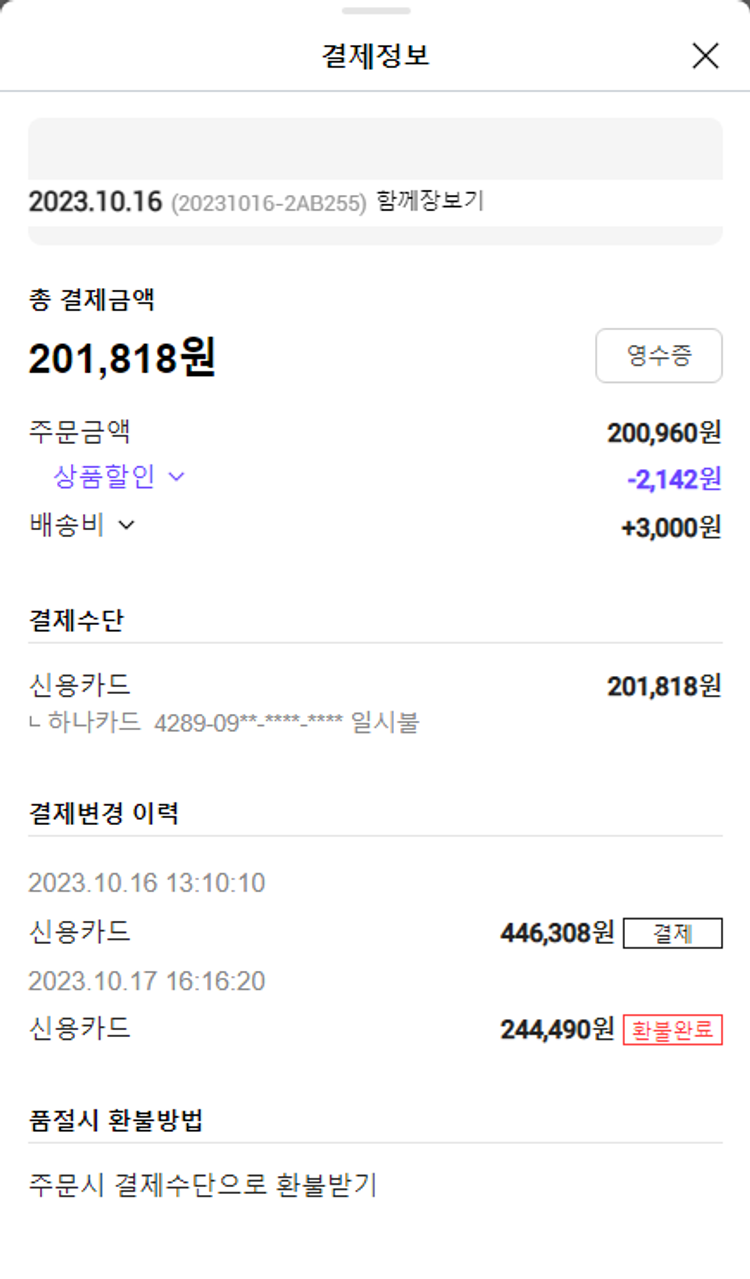 기부자님이 사용한 기부포인트 5,400원, 물품배송비 6,000원, 가격상승분 365원, 100원 미만 지원금 44원, 결제 수수료 11,008원, 기타 사업비는 행복나눔재단이 부담했습니다. (기부후기 발송시점에 최종 업데이트 됩니다.) 주문 건 중 품절 건 발생하여 2023. 10. 18. 재주문했습니다. 실제 쇼핑몰에서 확인되는 배송현황을 캡처한 내용입니다. 실시간 자료와는 차이가 있을 수 있습니다.