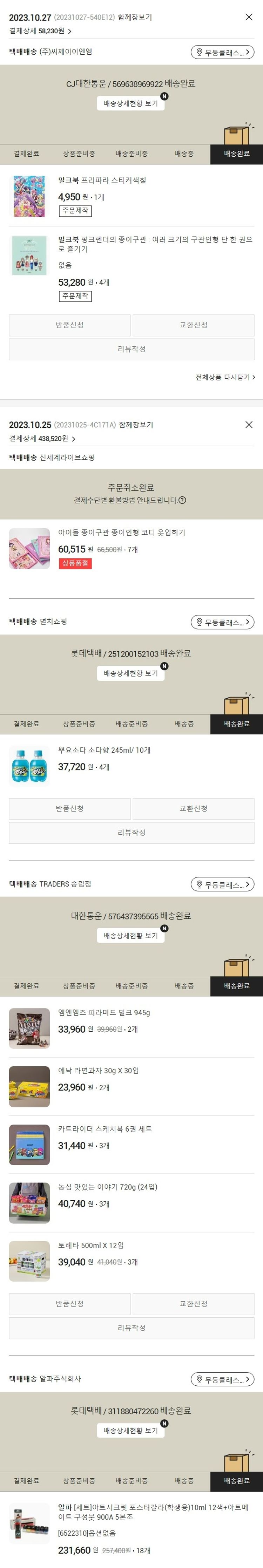 기부자님이 사용한 기부포인트 15,200원, 가격상승분 2,161원, 100원 미만 지원금 89원, 결제 수수료 10,354원, 기타 사업비는 행복나눔재단이 부담했습니다. (기부후기 발송시점에 최종 업데이트 됩니다.) 주문 건 중 품절 건 발생하여 2023. 10. 27. 재주문했습니다. 실제 쇼핑몰에서 확인되는 배송현황을 캡처한 내용입니다. 실시간 자료와는 차이가 있을 수 있습니다.