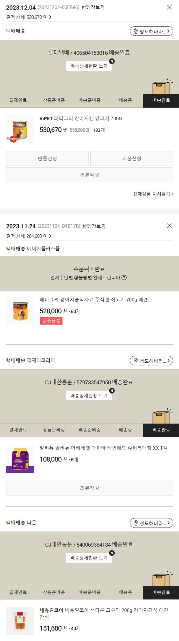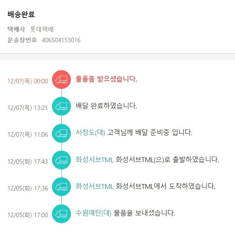 기부자님이 사용한 기부포인트 7,600원, 물품배송비 5,000원, 가격상승분 2,670원, 결제 수수료 19,913원, 기타 사업비는 행복나눔재단이 부담했습니다. (기부후기 발송시점에 최종 업데이트 됩니다.) 주문 건 중 품절 건 발생하여 2023. 12. 04. 재주문했습니다. 실제 쇼핑몰에서 확인되는 배송현황을 캡처한 내용입니다. 실시간 자료와는 차이가 있을 수 있습니다.