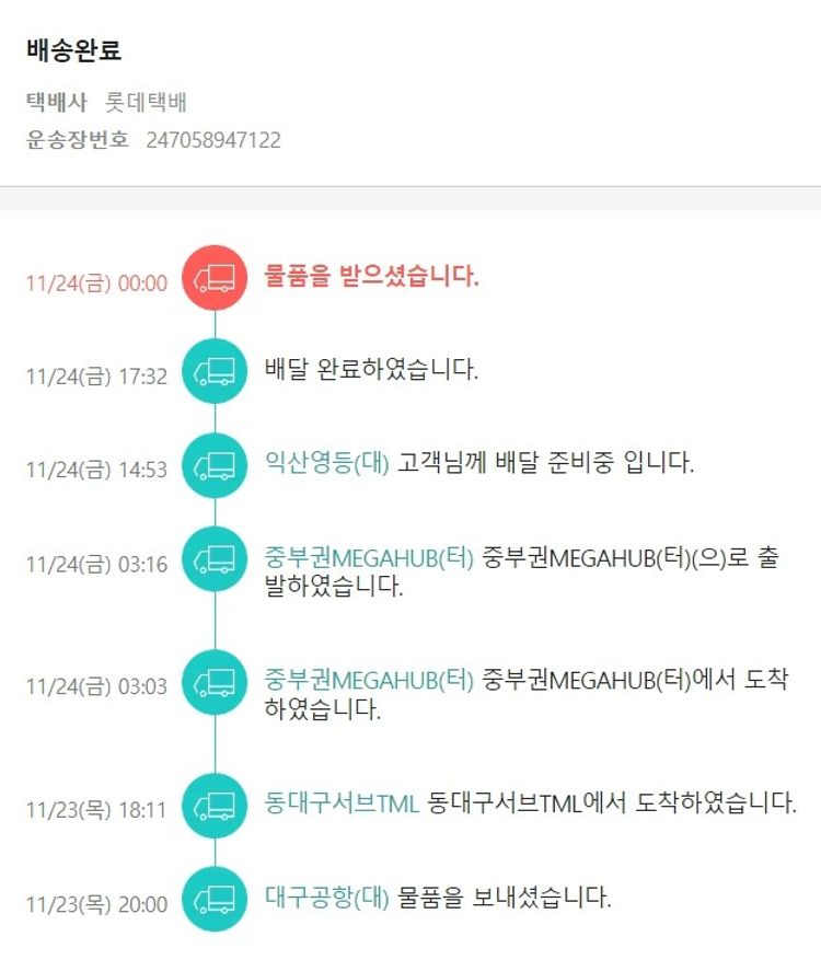 기부자님이 사용한 기부포인트 5,100원, 물품배송비 3,000원, 가격상승분 1,102원, 100원 미만 지원금 20원, 결제 수수료 9,766원, 기타 사업비는 행복나눔재단이 부담했습니다. (기부후기 발송시점에 최종 업데이트 됩니다.) 실제 쇼핑몰에서 확인되는 배송현황을 캡처한 내용입니다. 실시간 자료와는 차이가 있을 수 있습니다.