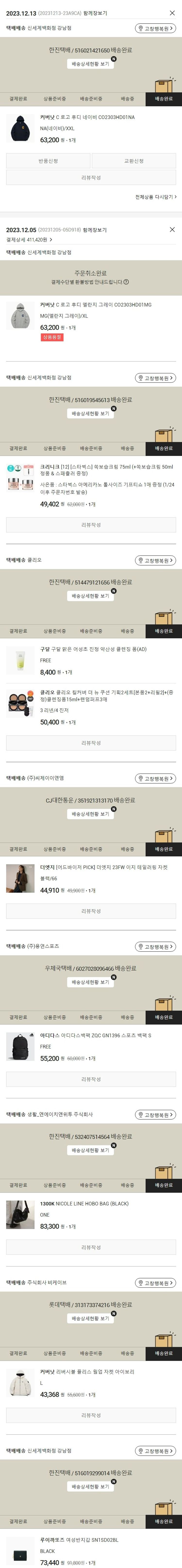 기부자님이 사용한 기부포인트 10,100원, 물품배송비 3,000원, 가격상승분 141원, 100원 미만 지원금 79원, 결제 수수료 10,274원, 기타 사업비는 행복나눔재단이 부담했습니다. (기부후기 발송시점에 최종 업데이트 됩니다.) 주문 건 중 품절 건 발생하여 2023. 12. 13. 재주문했습니다. 실제 쇼핑몰에서 확인되는 배송현황을 캡처한 내용입니다. 실시간 자료와는 차이가 있을 수 있습니다.