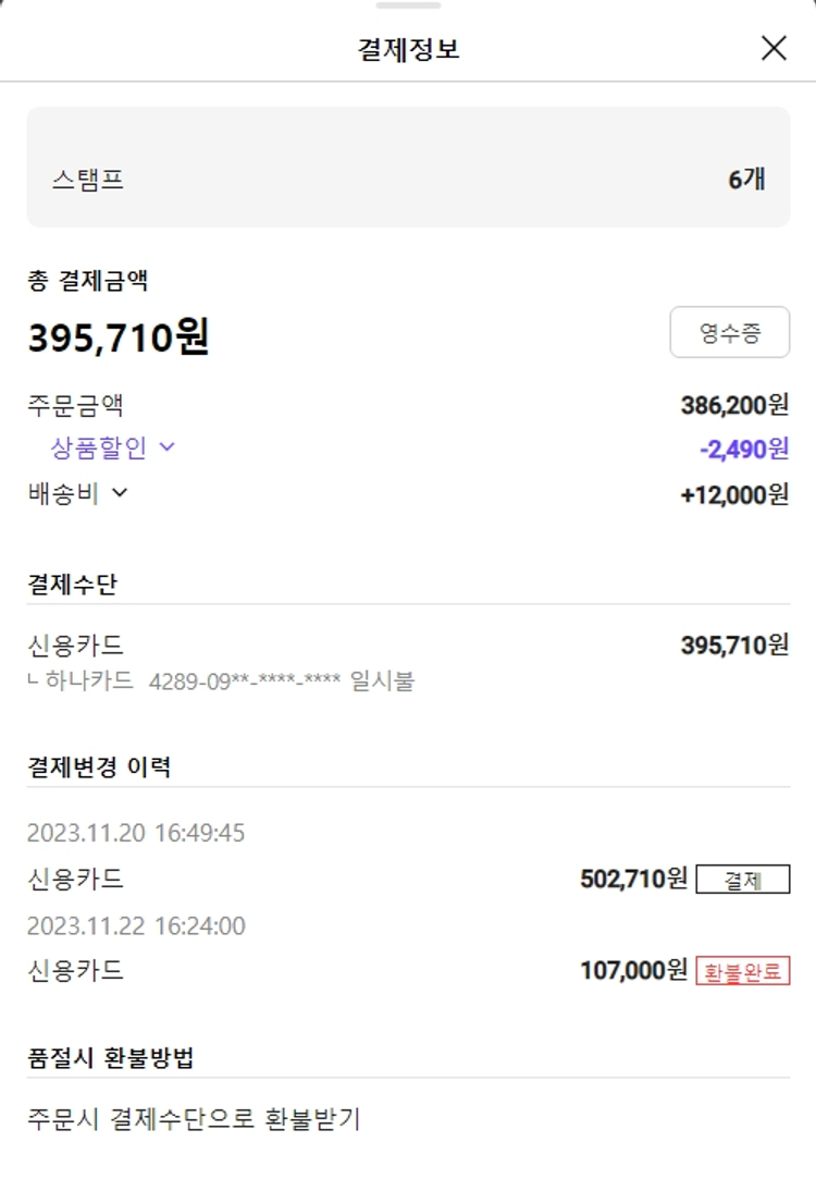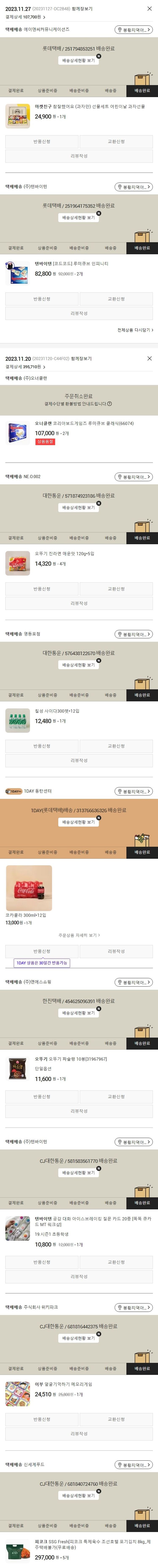 기부자님이 사용한 기부포인트 6,850원, 물품배송비 12,000원, 가격상승분 824원, 100원 미만 지원금 86원, 결제 수수료 11,012원, 기타 사업비는 행복나눔재단이 부담했습니다. (기부후기 발송시점에 최종 업데이트 됩니다.) 주문 건 중 품절 건 발생하여 2023. 11. 27. 재주문했습니다. 실제 쇼핑몰에서 확인되는 배송현황을 캡처한 내용입니다. 실시간 자료와는 차이가 있을 수 있습니다.