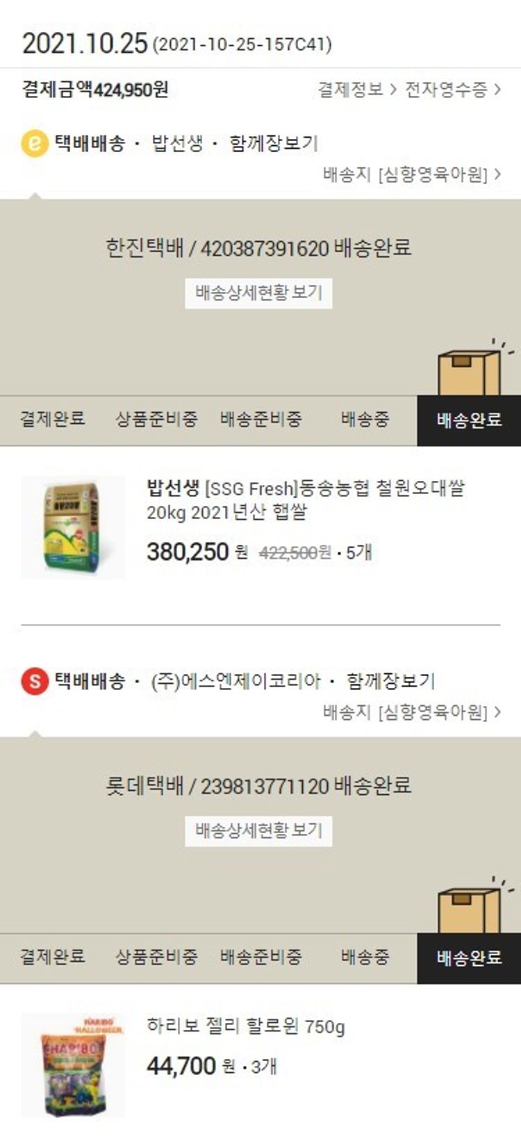 기부자님이 사용한 기부포인트 500원, 가격상승분 2,450원, 결제 수수료 9,291원, 기타 사업비는 행복나눔재단이 부담했습니다. (기부후기 발송시점에 최종 업데이트 됩니다.) 실제 쇼핑몰에서 확인되는 배송현황을 캡처한 내용입니다. 실시간 자료와는 차이가 있을 수 있습니다.