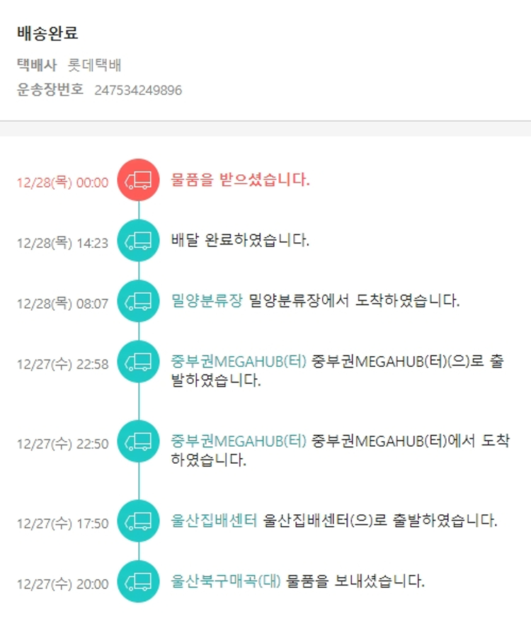 기부자님이 사용한 기부포인트 7,000원, 가격상승분 80원, 100원 미만 지원금 12원, 결제 수수료 17,354원, 기타 사업비는 행복나눔재단이 부담했습니다. (기부후기 발송시점에 최종 업데이트 됩니다.) 주문 건 중 품절 건 발생하여 2023. 12. 26. 재주문했습니다. 실제 쇼핑몰에서 확인되는 배송현황을 캡처한 내용입니다. 실시간 자료와는 차이가 있을 수 있습니다.