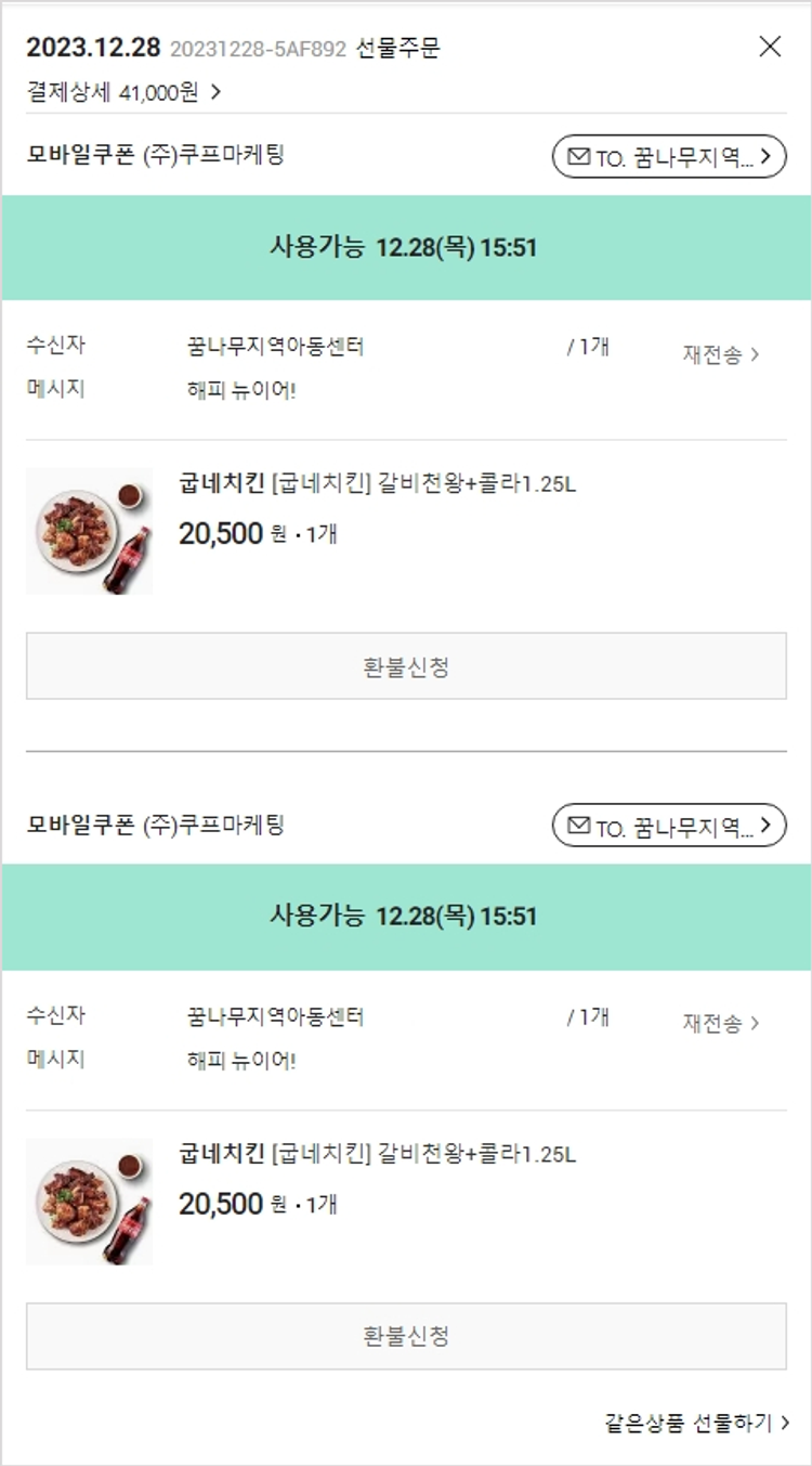 기부자님이 사용한 기부포인트 7,000원, 가격상승분 1,000원, 100원 미만 지원금 26원, 결제 수수료 9,125원, 기타 사업비는 행복나눔재단이 부담했습니다. (기부후기 발송시점에 최종 업데이트 됩니다.) 주문 건 중 품절 건 발생하여 2023. 12. 28. 기프티콘으로 재주문했습니다.