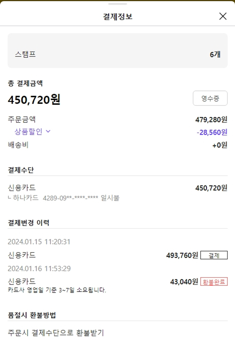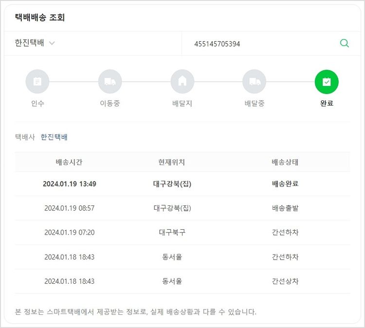 기부자님이 사용한 기부포인트 5,000원, 가격상승분 1,120원, 결제 수수료 8,241원, 기타 사업비는 행복나눔재단이 부담했습니다. (기부후기 발송시점에 최종 업데이트 됩니다.) 주문 건 중 품절 건 발생하여 2024. 01. 16. 재주문했습니다. 실제 쇼핑몰에서 확인되는 배송현황을 캡처한 내용입니다. 실시간 자료와는 차이가 있을 수 있습니다.