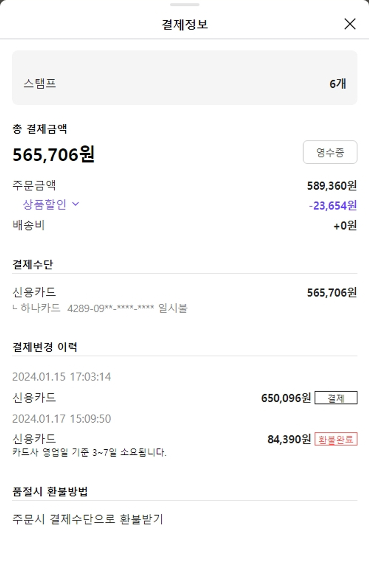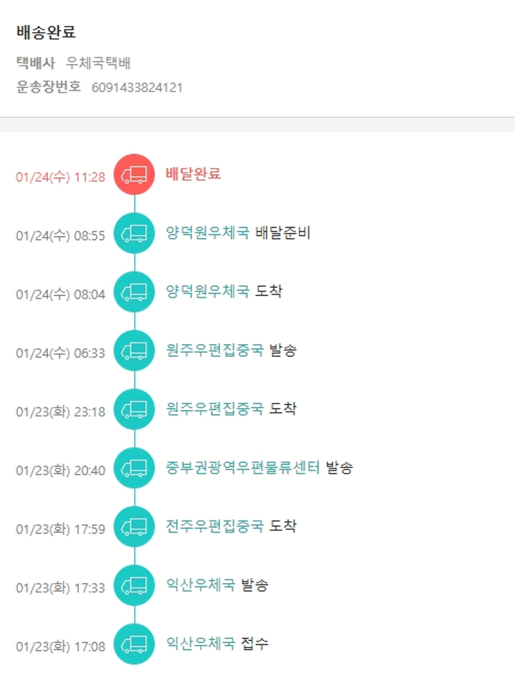 가격상승분 670원, 100원 미만 지원금 96원, 기타 사업비는 행복나눔재단이 부담했습니다. (기부후기 발송시점에 최종 업데이트 됩니다.) 주문 건 중 품절 건 발생하여 2024. 01. 19. 재주문했습니다. 실제 쇼핑몰에서 확인되는 배송현황을 캡처한 내용입니다. 실시간 자료와는 차이가 있을 수 있습니다.