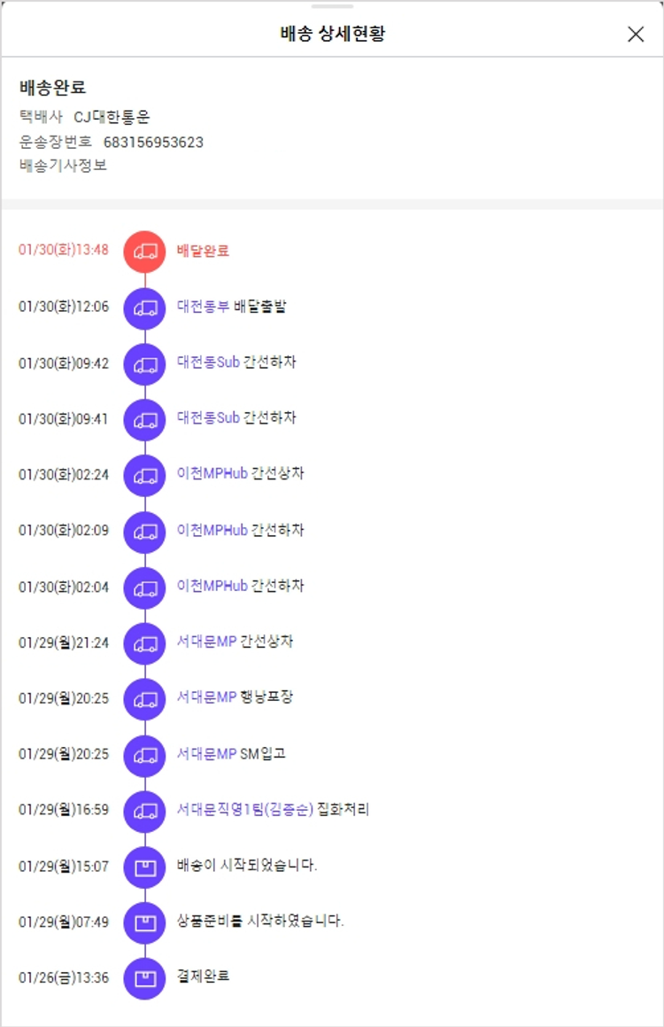 기부자님이 사용한 기부포인트 14,500원, 가격상승분 184원, 100원 미만 지원금 82원, 결제 수수료 8,226원, 기타 사업비는 행복나눔재단이 부담했습니다. (기부후기 발송시점에 최종 업데이트 됩니다.) 실제 쇼핑몰에서 확인되는 배송현황을 캡처한 내용입니다. 실시간 자료와는 차이가 있을 수 있습니다.