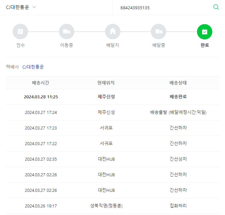 기부자님이 사용한 기부포인트 11,500원, 물품배송비 14,000원, 가격상승분 2,916원, 100원 미만 지원금 32원, 결제 수수료 13,930원, 기타 사업비는 행복나눔재단이 부담했습니다. (기부후기 발송시점에 최종 업데이트 됩니다.) 주문 건 중 품절 건 발생하여 2024. 03. 25. 재주문했습니다. 실제 쇼핑몰에서 확인되는 배송현황을 캡처한 내용입니다. 실시간 자료와는 차이가 있을 수 있습니다.