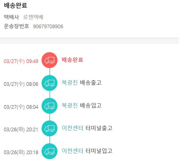 기부자님이 사용한 기부포인트 6,000원, 가격상승분 3,610원, 100원 미만 지원금 10원, 결제 수수료 9,230원, 기타 사업비는 행복나눔재단이 부담했습니다. (기부후기 발송시점에 최종 업데이트 됩니다.) 주문 건 중 품절 건 발생하여 2024. 03. 25. 재주문했습니다. 실제 쇼핑몰에서 확인되는 배송현황을 캡처한 내용입니다. 실시간 자료와는 차이가 있을 수 있습니다.