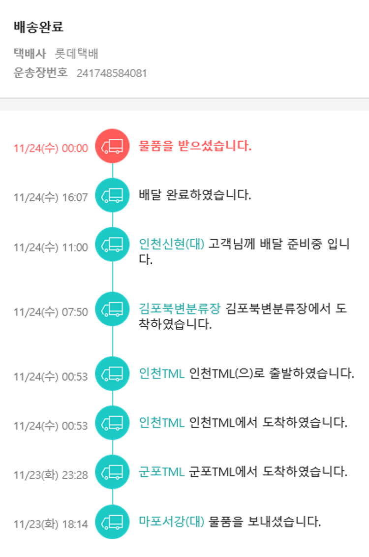 기부자님이 사용한 기부포인트 82,850원, 물품배송비 5,500원, 가격상승분 1,049원, 100원 미만 지원금 64원, 결제 수수료 10,707원, 기타 사업비는 행복나눔재단이 부담했습니다. (기부후기 발송시점에 최종 업데이트 됩니다.) 실제 쇼핑몰에서 확인되는 배송현황을 캡처한 내용입니다. 실시간 자료와는 차이가 있을 수 있습니다.