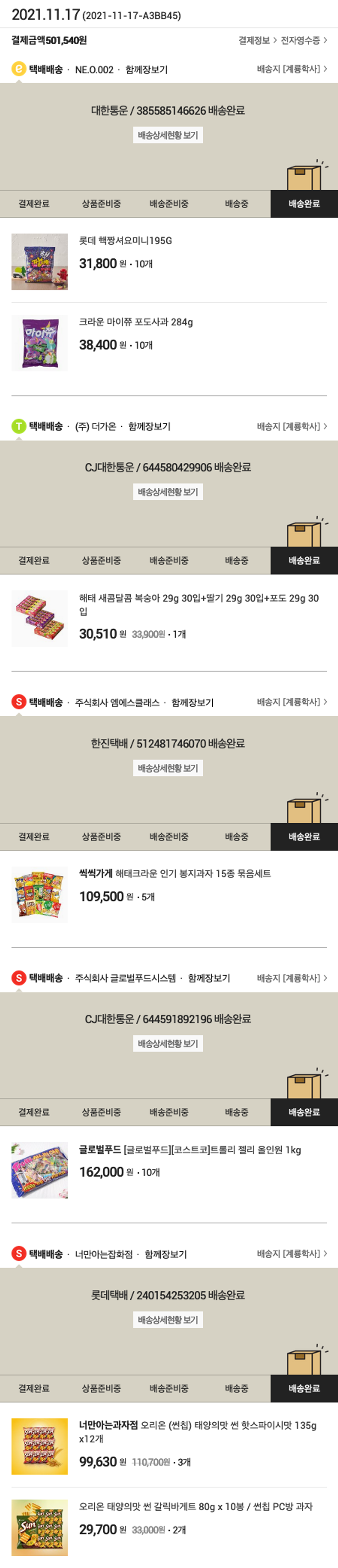 해태크라운 인기 봉지과자 15종 묶음세트5개 (개당 21,900원)