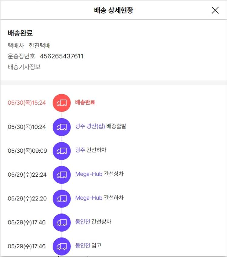 실제 쇼핑몰에서 확인되는 배송현황을 캡처한 내용입니다. 실시간 자료와는 차이가 있을 수 있습니다.