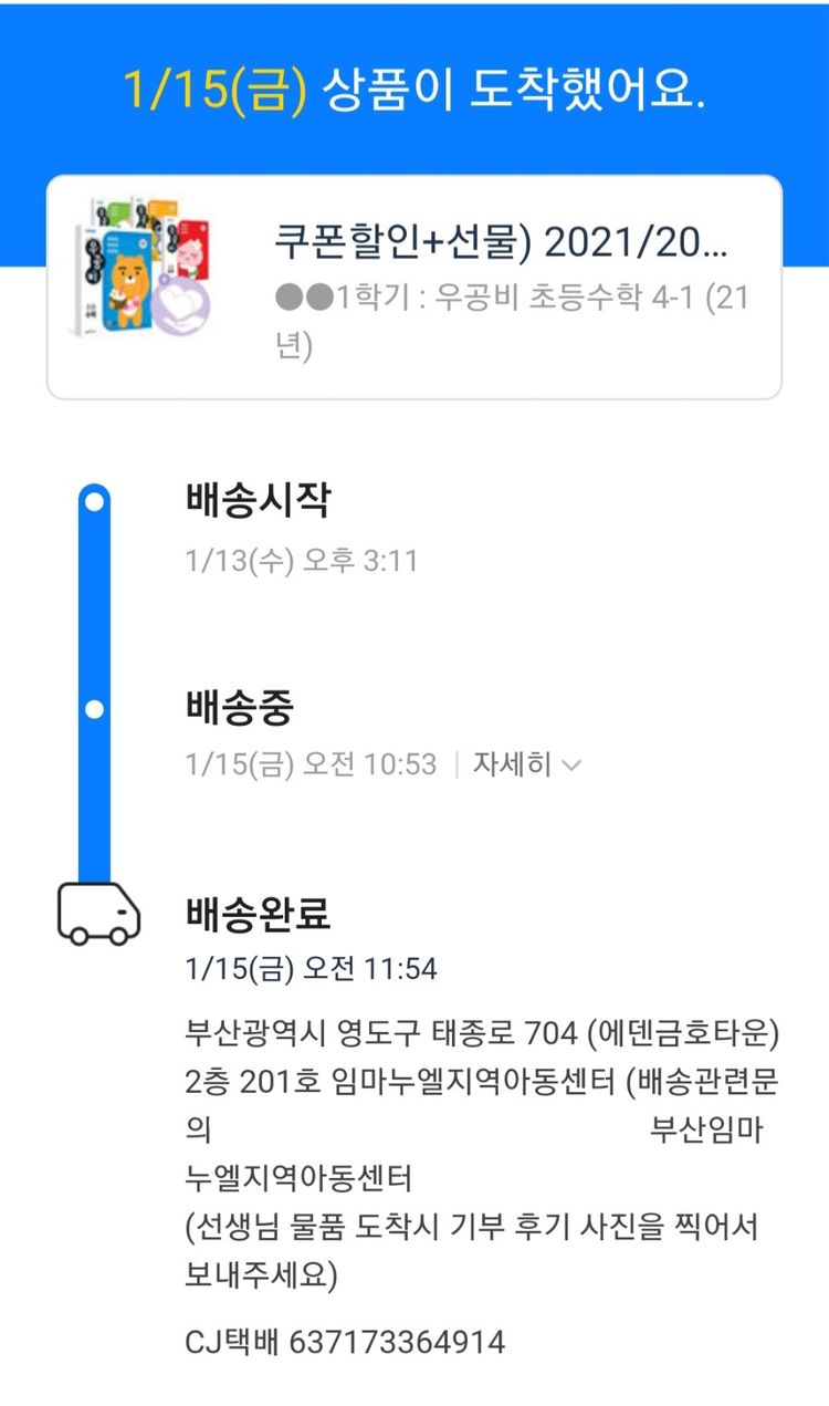 기부자님이 사용한 기부포인트 31,500원, 가격상승분 550원, 결제 수수료 16,218원, 기타 사업비는 행복나눔재단이 부담했습니다. (기부후기 발송시점에 최종 업데이트 됩니다.) 실제 쇼핑몰에서 확인되는 배송현황을 캡처한 내용입니다. 실시간 자료와는 차이가 있을 수 있습니다.