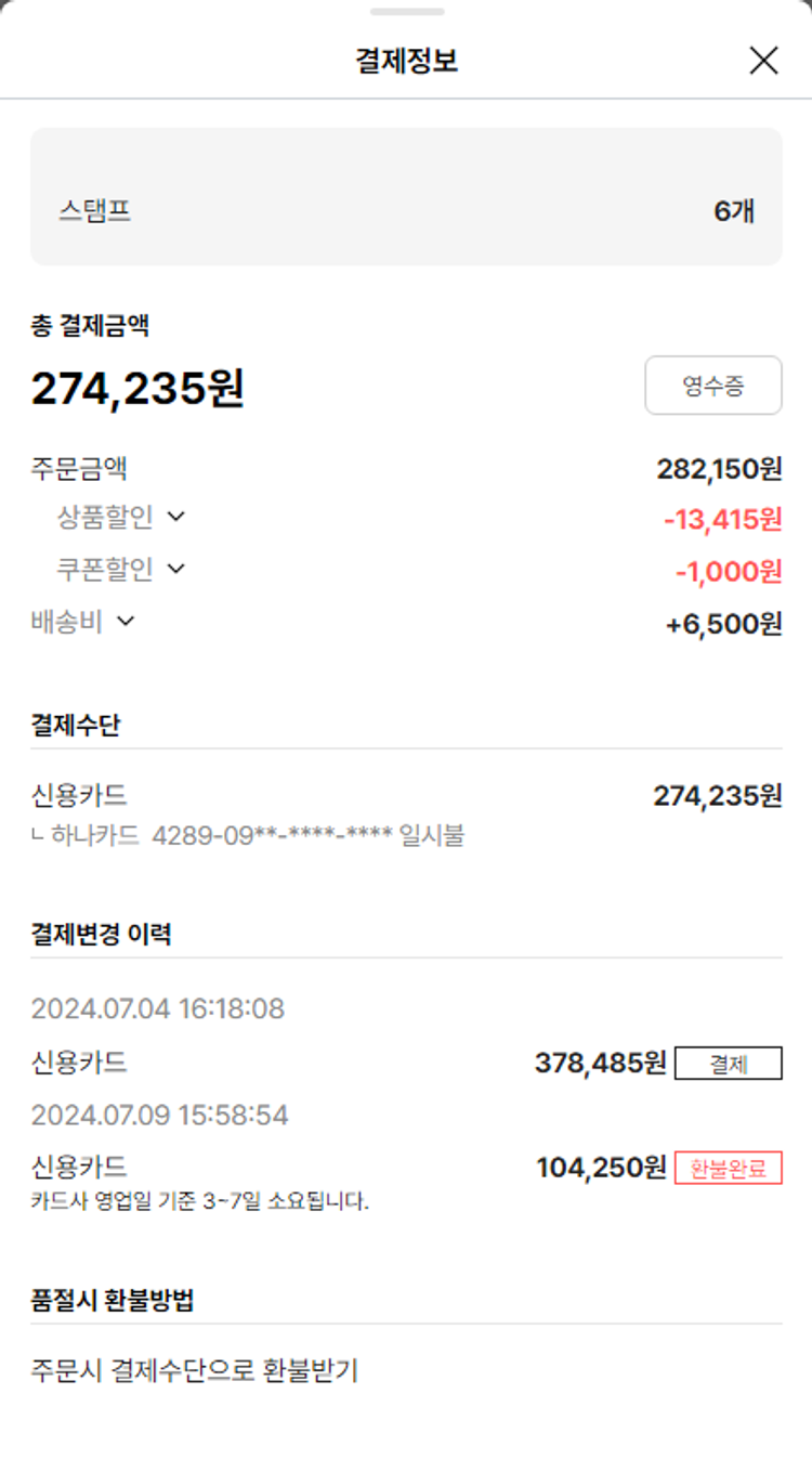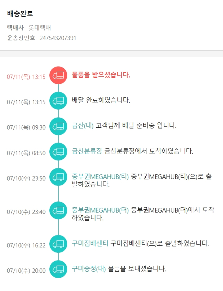 물품배송비 6,500원, 가격상승분 3,085원, 100원 미만 지원금 90원, 결제 수수료 6,892원, 기타 사업비는 행복나눔재단이 부담했습니다. (기부후기 발송시점에 최종 업데이트 됩니다.) 주문 건 중 품절 건 발생하여 2024. 07. 09. 재주문했습니다. 실제 쇼핑몰에서 확인되는 배송현황을 캡처한 내용입니다. 실시간 자료와는 차이가 있을 수 있습니다.