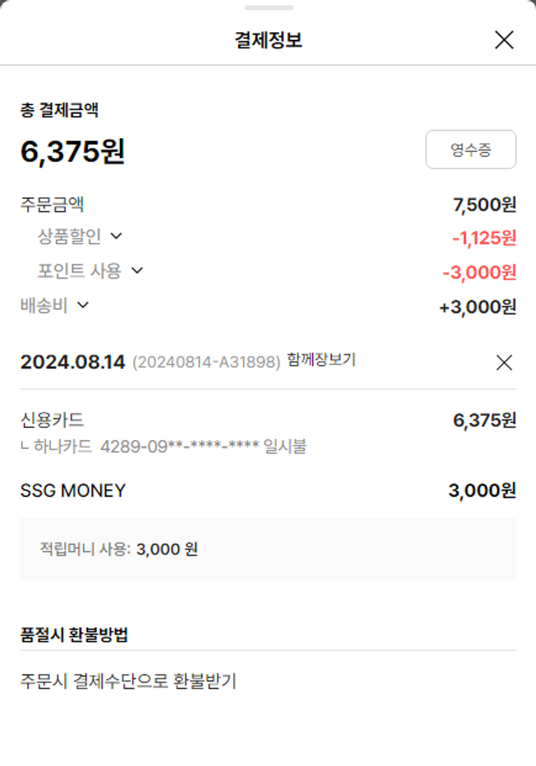 물품배송비 6,000원, 가격상승분 1,099원, 100원 미만 지원금 70원, SSG 머니 3,000포인트, 결제 수수료 17,140원, 기타 사업비는 행복나눔재단이 부담했습니다. (기부후기 발송시점에 최종 업데이트 됩니다.) 주문 건 중 품절 건 발생하여 2024. 08. 19. 재주문했습니다. 실제 쇼핑몰에서 확인되는 배송현황을 캡처한 내용입니다. 실시간 자료와는 차이가 있을 수 있습니다.