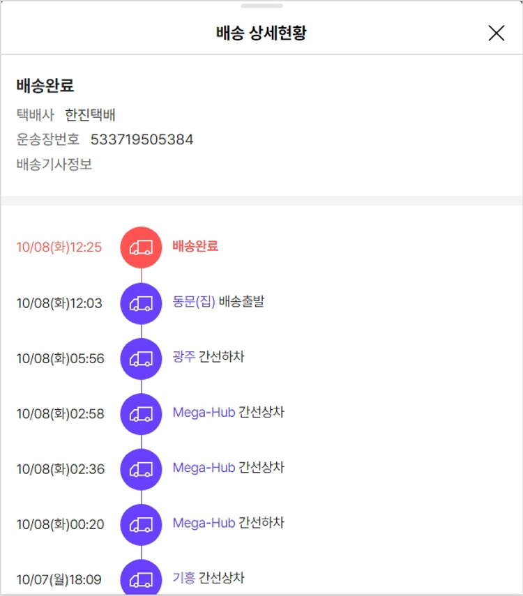 실제 쇼핑몰에서 확인되는 배송현황을 캡처한 내용입니다. 실시간 자료와는 차이가 있을 수 있습니다.