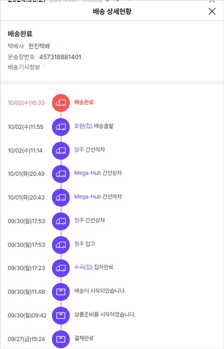 실제 쇼핑몰에서 확인되는 배송현황을 캡처한 내용입니다. 실시간 자료와는 차이가 있을 수 있습니다.