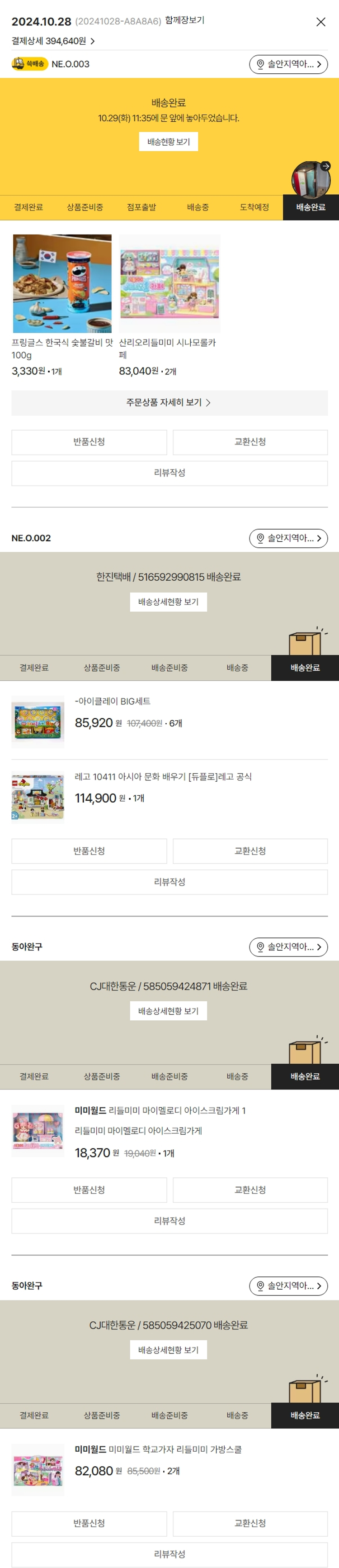 기부자님이 사용한 기부포인트 15,300원, 물품배송비 7,000원, 가격상승분 40원, 결제 수수료 11,179원, 기타 사업비는 행복나눔재단이 부담했습니다. (기부후기 발송시점에 최종 업데이트 됩니다.) 실제 쇼핑몰에서 확인되는 배송현황을 캡처한 내용입니다. 실시간 자료와는 차이가 있을 수 있습니다.
