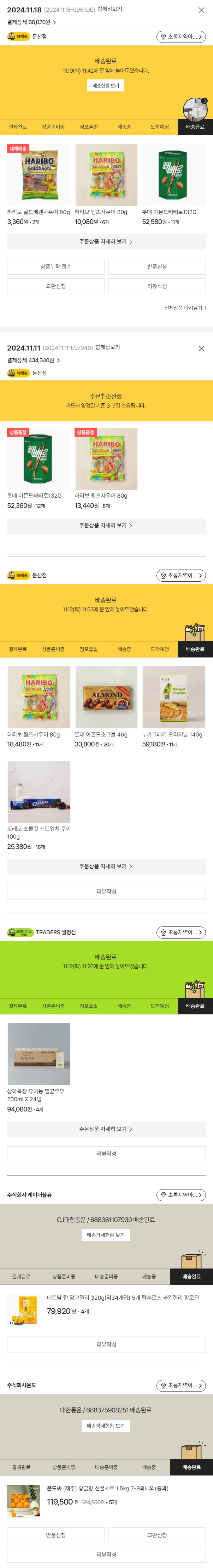 기부자님이 사용한 기부포인트 3,000원, 물품배송비 4,000원, 가격상승분 616원, 100원 미만 지원금 44원, 결제 수수료 12,495원, 기타 사업비는 행복나눔재단이 부담했습니다. (기부후기 발송시점에 최종 업데이트 됩니다.) 주문 건 중 품절 건 발생하여 2024-11-18 재주문하였습니다. 실제 쇼핑몰에서 확인되는 배송현황을 캡처한 내용입니다. 실시간 자료와는 차이가 있을 수 있습니다.