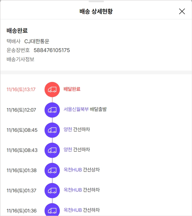 기부자님이 사용한 기부포인트 8,500원, 가격상승분 7,200원, 100원 미만 지원금 55원, 결제 수수료 14,983원, 기타 사업비는 행복나눔재단이 부담했습니다. (기부후기 발송시점에 최종 업데이트 됩니다.) 주문 건 중 품절 건 발생하여 2024-11-13 재주문했습니다. 실제 쇼핑몰에서 확인되는 배송현황을 캡처한 내용입니다. 실시간 자료와는 차이가 있을 수 있습니다.