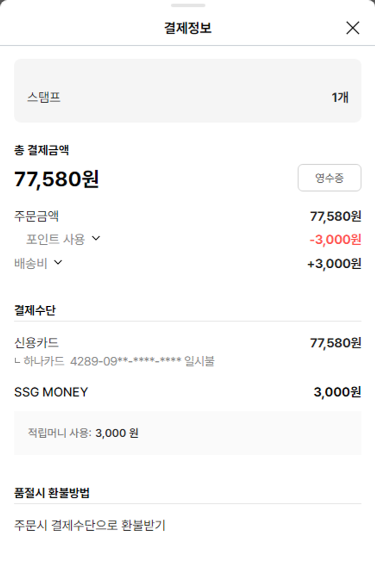 물품배송비 3,000원, 가격상승분 1,610원, SSG 머니 3,000포인트, 결제 수수료 23,302원, 기타 사업비는 행복나눔재단이 부담했습니다. (기부후기 발송시점에 최종 업데이트 됩니다.) 주문 건 중 품절 건 발생하여 2024-10-25 재주문했습니다. 실제 쇼핑몰에서 확인되는 배송현황을 캡처한 내용입니다. 실시간 자료와는 차이가 있을 수 있습니다.