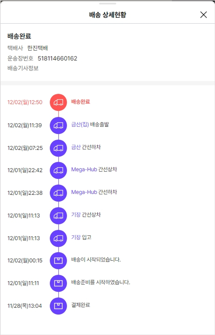 기부자님이 사용한 기부포인트 6,650원, 가격상승분 60원, 100원 미만 지원금 18원, 결제 수수료 10,579원, 기타 사업비는 행복나눔재단이 부담했습니다. (기부후기 발송시점에 최종 업데이트 됩니다.) 실제 쇼핑몰에서 확인되는 배송현황을 캡처한 내용입니다. 실시간 자료와는 차이가 있을 수 있습니다.