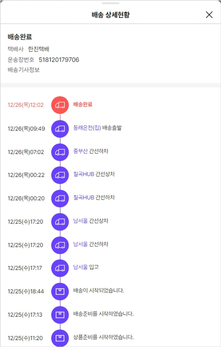 실제 쇼핑몰에서 확인되는 배송현황을 캡처한 내용입니다. 실시간 자료와는 차이가 있을 수 있습니다.