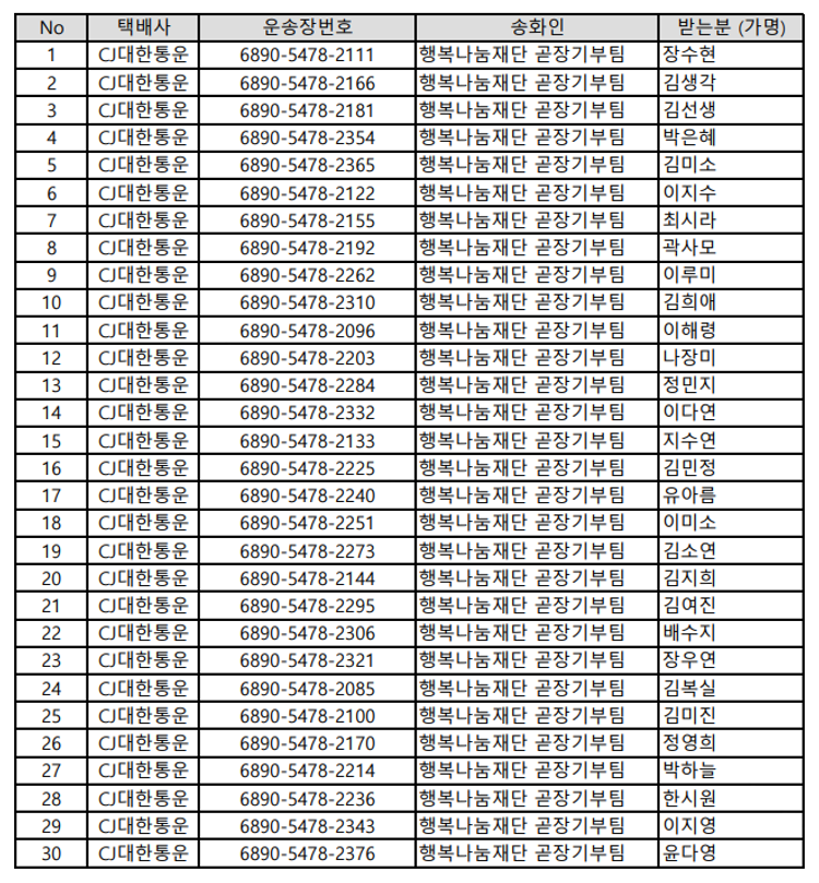 기부자님이 사용한 기부포인트 253,450원, 결제 수수료 631,157원, 기타 사업비는 행복나눔재단이 부담했습니다. (기부후기 발송시점에 최종 업데이트 됩니다.) 실제 쇼핑몰에서 확인되는 배송현황을 캡처한 내용입니다. 실시간 자료와는 차이가 있을 수 있습니다.
