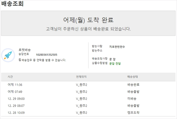 실제 쇼핑몰에서 확인되는 배송현황을 캡처한 내용입니다. 실시간 자료와는 차이가 있을 수 있습니다.
