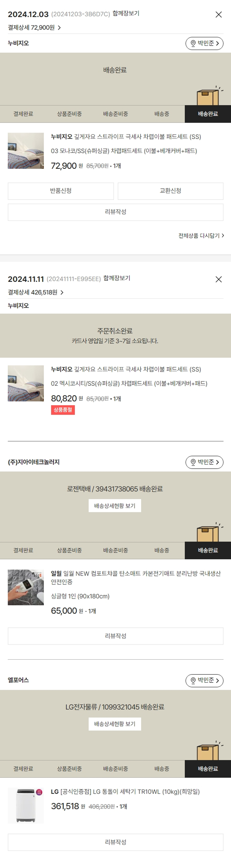 기부자님이 사용한 기부포인트 47,100원, 가격상승분 10,424원, 100원 미만 지원금 94원, 결제 수수료 12,041원, 기타 사업비는 행복나눔재단이 부담했습니다. (기부후기 발송시점에 최종 업데이트 됩니다.) 주문 건 중 품절 건 발생하여 2024-12-03 재주문했습니다. 실제 쇼핑몰에서 확인되는 배송현황을 캡처한 내용입니다. 실시간 자료와는 차이가 있을 수 있습니다.