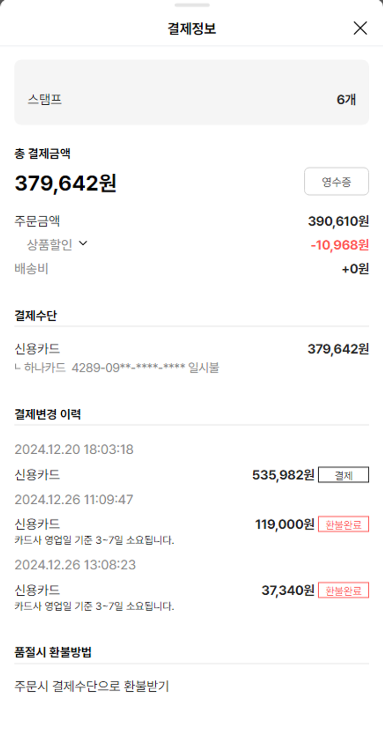 물품배송비 3,000원, 가격상승분 180원, 100원 미만 지원금 42원, 결제 수수료 13,498원, 기타 사업비는 행복나눔재단이 부담했습니다. (기부후기 발송시점에 최종 업데이트 됩니다.) 주문 건 중 품절 건 발생하여 2024-12-26 재주문했습니다. 실제 쇼핑몰에서 확인되는 배송현황을 캡처한 내용입니다. 실시간 자료와는 차이가 있을 수 있습니다.