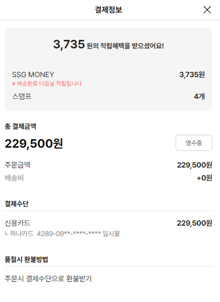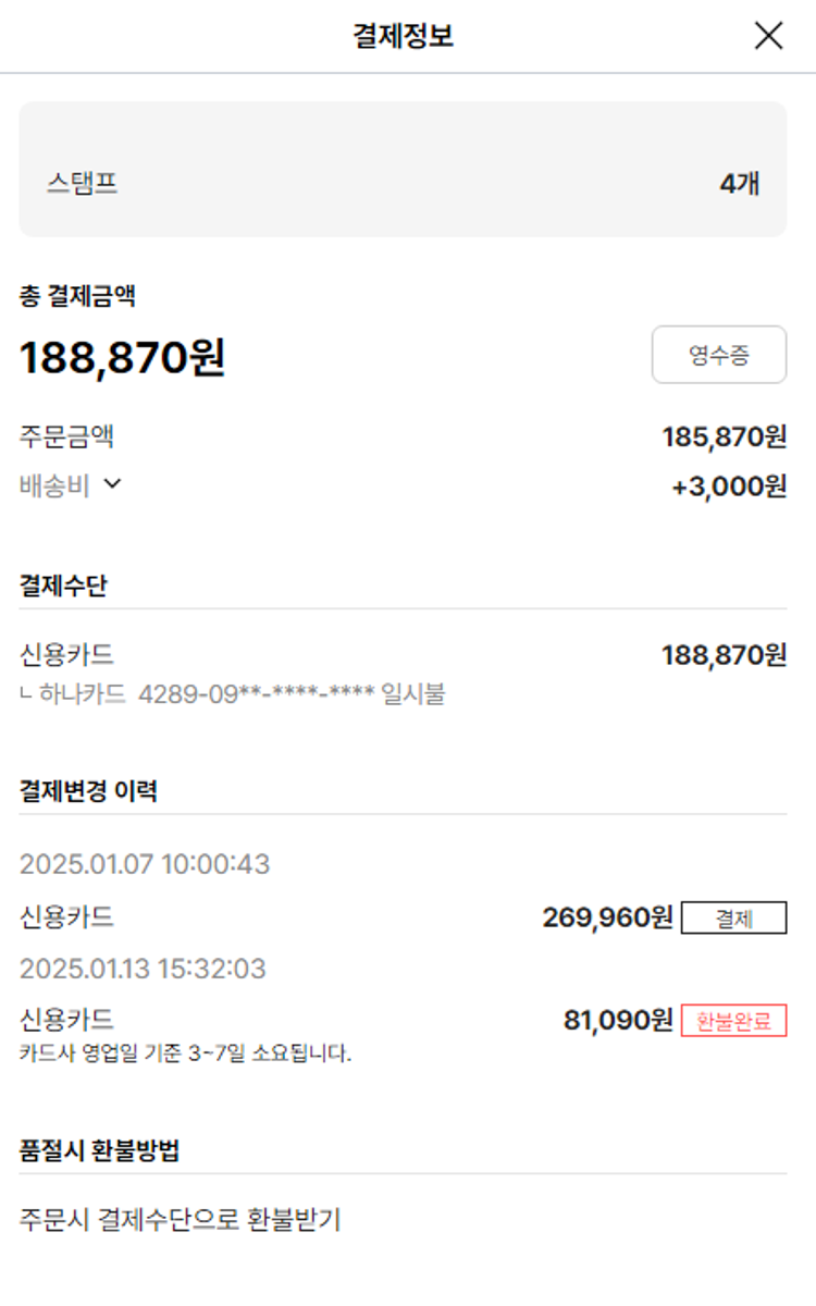 물품배송비 3,000원, 가격상승분 1,270원, 100원 미만 지원금 50원, 결제 수수료 15,361원, 기타 사업비는 행복나눔재단이 부담했습니다. (기부후기 발송시점에 최종 업데이트 됩니다.) 주문 상품 중 품절 건이 있어 2025-01-13 재주문하였습니다. 실제 쇼핑몰에서 확인되는 배송현황을 캡처한 내용입니다. 실시간 자료와는 차이가 있을 수 있습니다.