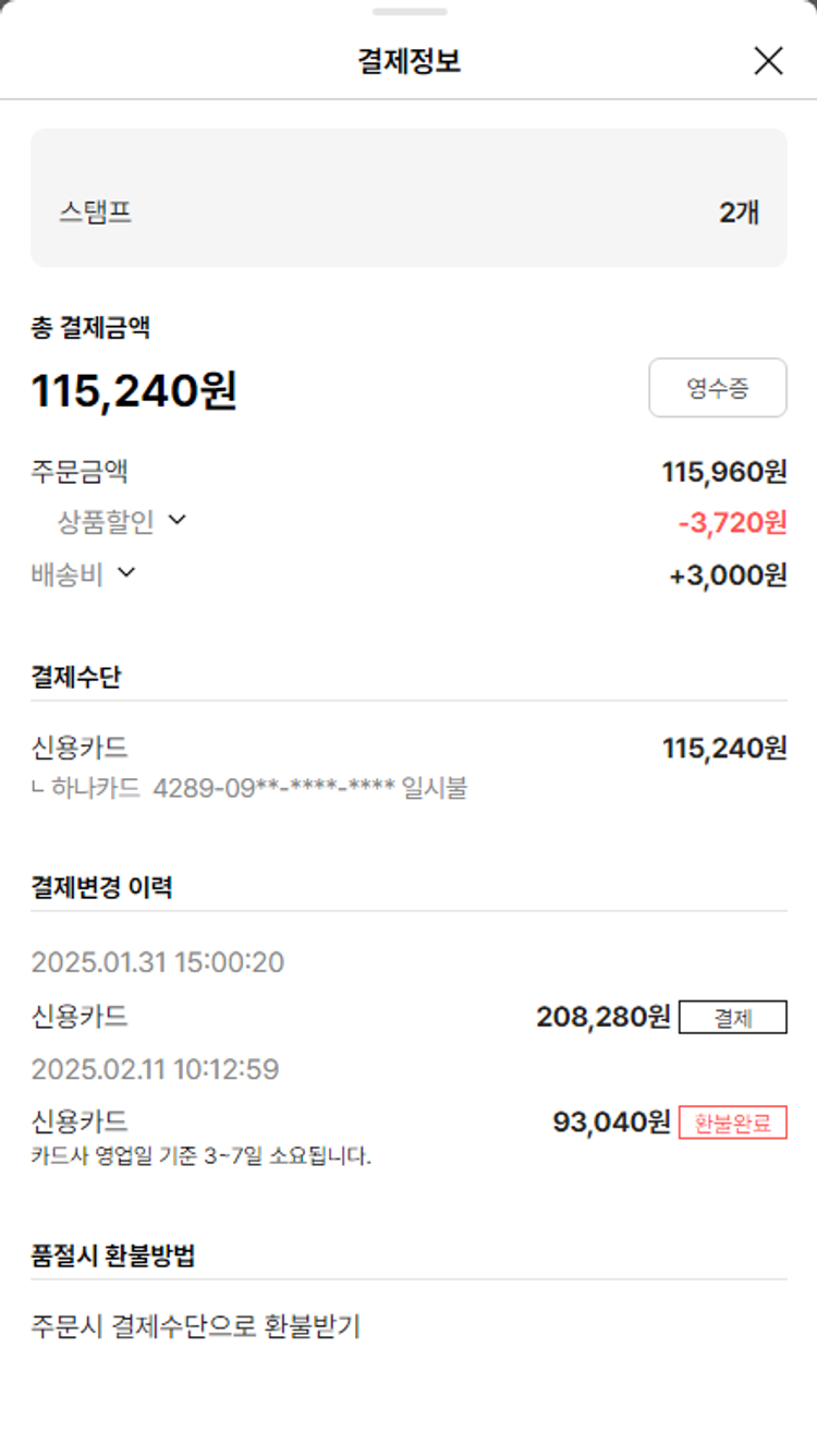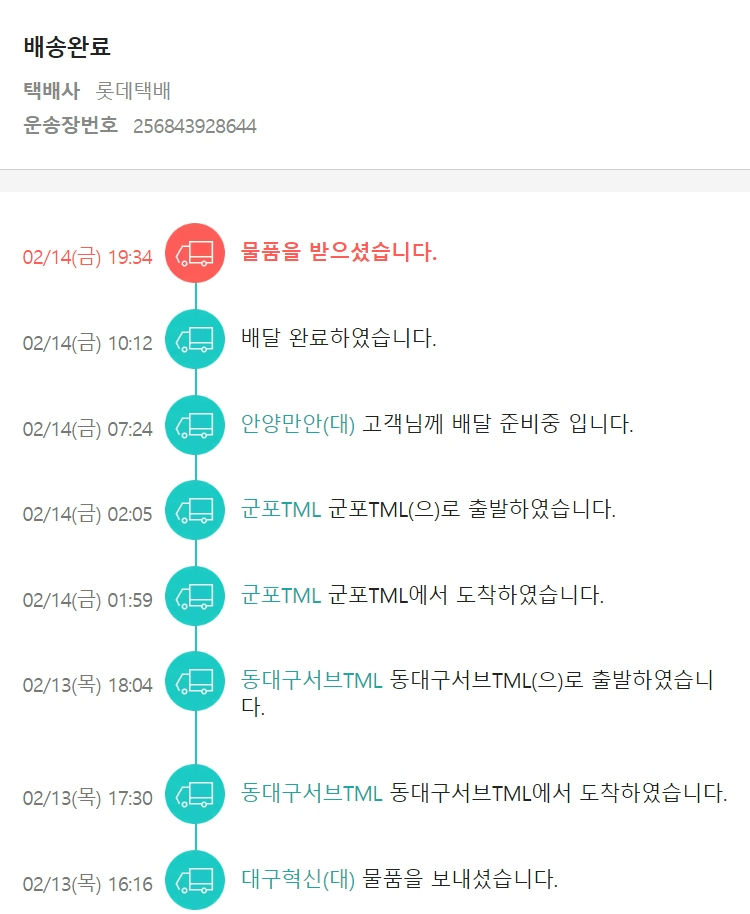 물품배송비 3,000원, 가격상승분 2,960원, 100원 미만 지원금 60원, 기타 사업비는 행복나눔재단이 부담했습니다. (기부후기 발송시점에 최종 업데이트 됩니다.) 주문 상품 중 품절 발생하여 2025-02-12 재주문하였습니다. 실제 쇼핑몰에서 확인되는 배송현황을 캡처한 내용입니다. 실시간 자료와는 차이가 있을 수 있습니다.
