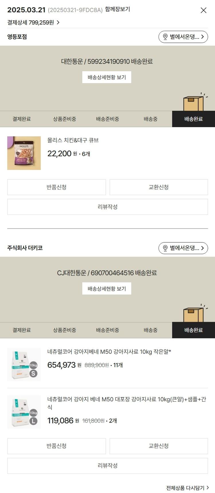 기부자님이 사용한 기부포인트 5,000원, 물품배송비 3,000원, 가격상승분 2,497원, 100원 미만 지원금 62원, 결제 수수료 17,595원, 기타 사업비는 행복나눔재단이 부담했습니다. (기부후기 발송시점에 최종 업데이트 됩니다.) 날씨 변화로 인한 상황을 고려하여 선생님과 논의 후 핫팩 대신 사료 물품으로 대체하였습니다. 실제 쇼핑몰에서 확인되는 배송현황을 캡처한 내용입니다. 실시간 자료와는 차이가 있을 수 있습니다.
