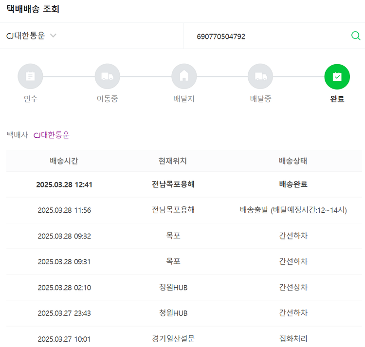 기부자님이 사용한 기부포인트 9,000원, 물품배송비 3,000원, 가격상승분 4,910원, 100원 미만 지원금 70원, 결제 수수료 10,625원, 기타 사업비는 행복나눔재단이 부담했습니다. (기부후기 발송시점에 최종 업데이트 됩니다.) 상품 주문 건 중 품절 발생하여 2025-03-27 재주문하였습니다. 실제 쇼핑몰에서 확인되는 배송현황을 캡처한 내용입니다. 실시간 자료와는 차이가 있을 수 있습니다.