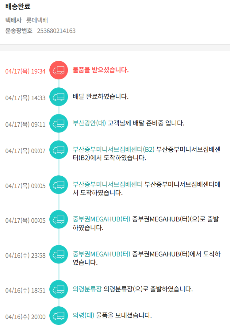 가격상승분 4,180원, 결제 수수료 10,946원, 기타 사업비는 행복나눔재단이 부담했습니다. (기부후기 발송시점에 최종 업데이트 됩니다.) 실제 쇼핑몰에서 확인되는 배송현황을 캡처한 내용입니다. 실시간 자료와는 차이가 있을 수 있습니다.