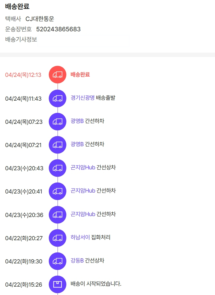 기부자님이 사용한 기부포인트 13,500원, 가격상승분 10,190원, 100원 미만 지원금 10원, 결제 수수료 10,838원, 기타 사업비는 행복나눔재단이 부담했습니다. (기부후기 발송시점에 최종 업데이트 됩니다.) 실제 쇼핑몰에서 확인되는 배송현황을 캡처한 내용입니다. 실시간 자료와는 차이가 있을 수 있습니다.