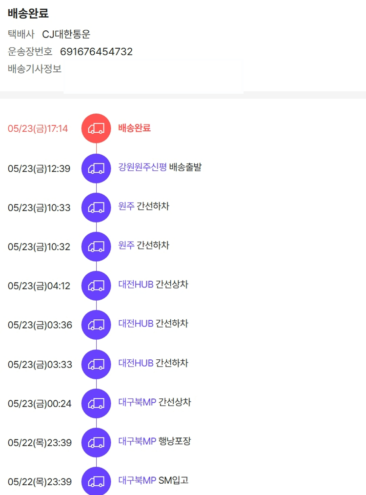 기부자님이 사용한 기부포인트 17,500원, 물품배송비 15,500원, 가격상승분 895원, 100원 미만 지원금 63원, 결제 수수료 14,067원, 기타 사업비는 행복나눔재단이 부담했습니다. (기부후기 발송시점에 최종 업데이트 됩니다.) 상품 주문 건 중 품절 발생하여 2025-05-21 재주문하였습니다. 실제 쇼핑몰에서 확인되는 배송현황을 캡처한 내용입니다. 실시간 자료와는 차이가 있을 수 있습니다.