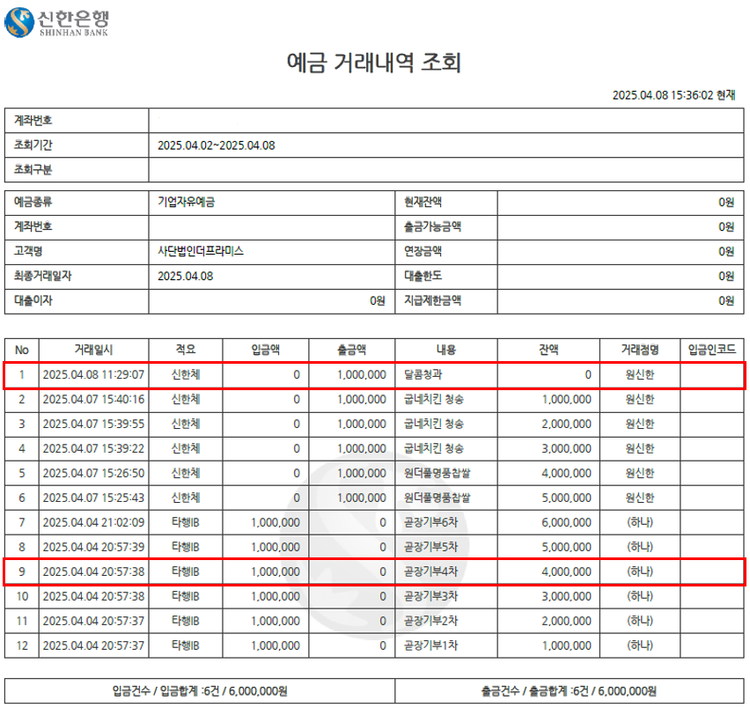 기부자님이 사용한 기부포인트 38,500원, 결제 수수료 24,103원, 기타 사업비는 행복나눔재단이 부담했습니다. (기부후기 발송시점에 최종 업데이트 됩니다.) 2025-04-02에 진행된 산불 피해 모금은 총 6차까지 모금 완료되어 2025-04-03에 일괄 이체되었습니다. 이체 내역은 하단의 결제정보 보기를 통해 확인 가능합니다.