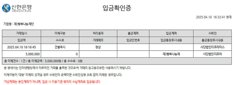 기타 사업비는 행복나눔재단이 부담했습니다. (기부후기 발송시점에 최종 업데이트 됩니다.) 2025-04-09에 진행된 산불 피해 모금 13차가 완료되어 2025-04-10에 이체되었습니다. 이체 내역은 하단의 결제정보 보기를 통해 확인 가능합니다.
