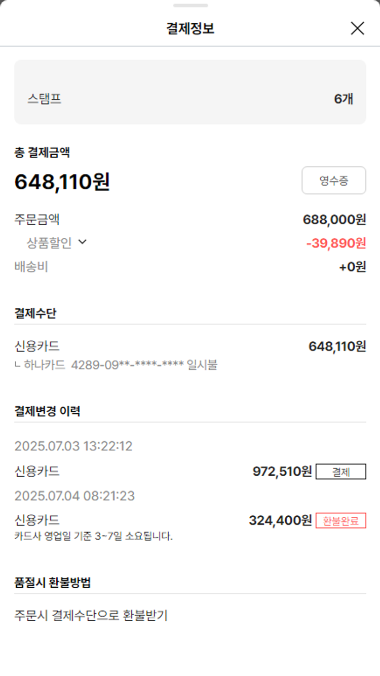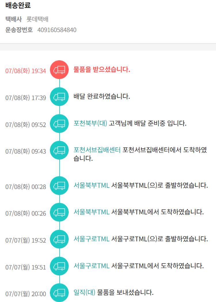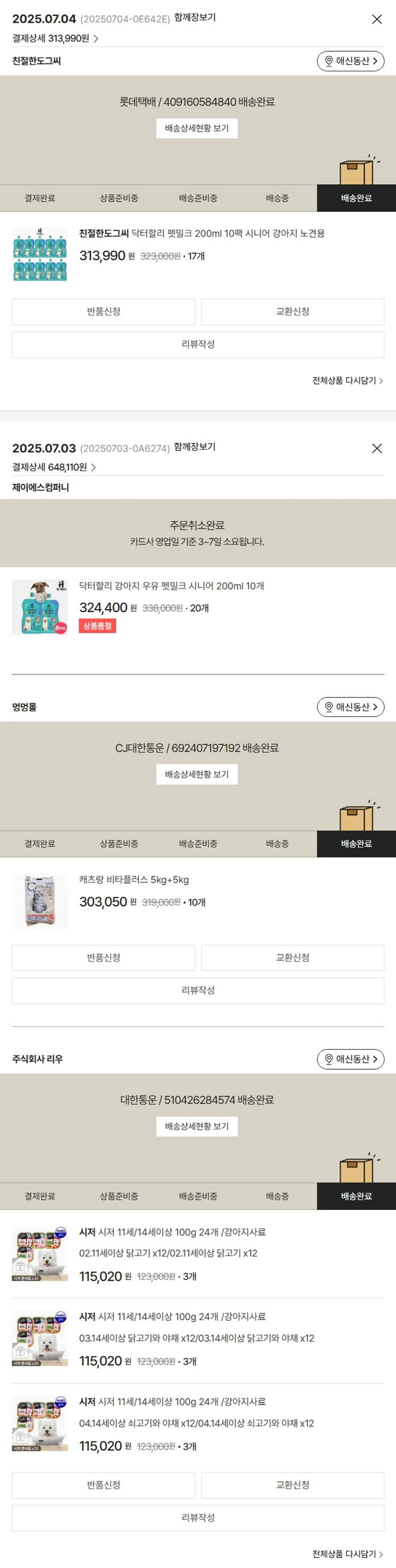기부자님이 사용한 기부포인트 42,650원, 가격상승분 5,220원, 100원 미만 지원금 80원, 결제 수수료 21,451원, 기타 사업비는 행복나눔재단이 부담했습니다. (기부후기 발송시점에 최종 업데이트 됩니다.) 상품 주문 건 중 품절 발생하여 2025-07-04 재주문하였습니다. 실제 쇼핑몰에서 확인되는 배송현황을 캡처한 내용입니다. 실시간 자료와는 차이가 있을 수 있습니다.
