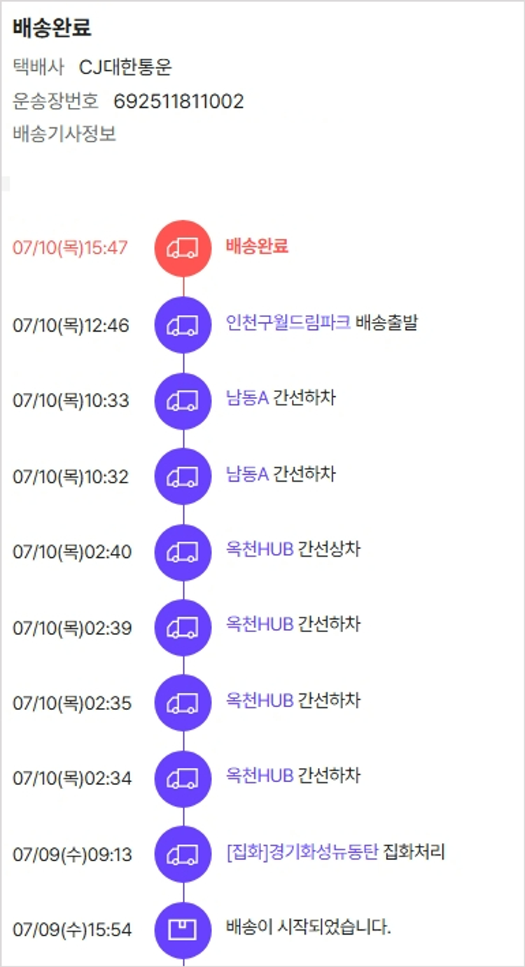 물품배송비 9,000원, 가격상승분 11,470원, 결제 수수료 11,033원, 기타 사업비는 행복나눔재단이 부담했습니다. (기부후기 발송시점에 최종 업데이트 됩니다.) 상품 주문 건 중 품절 발생하여 2025-07-08 재주문하였습니다. 실제 쇼핑몰에서 확인되는 배송현황을 캡처한 내용입니다. 실시간 자료와는 차이가 있을 수 있습니다.