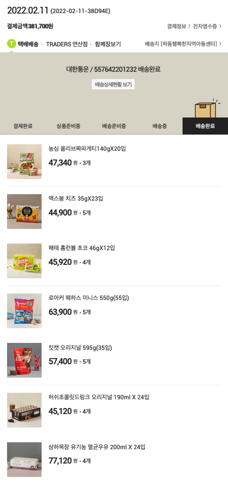 기부자님이 사용한 기부포인트 4,000원, 결제 수수료 12,038원, 기타 사업비는 행복나눔재단이 부담했습니다. (기부후기 발송시점에 최종 업데이트 됩니다.) 실제 쇼핑몰에서 확인되는 배송현황을 캡처한 내용입니다. 실시간 자료와는 차이가 있을 수 있습니다.