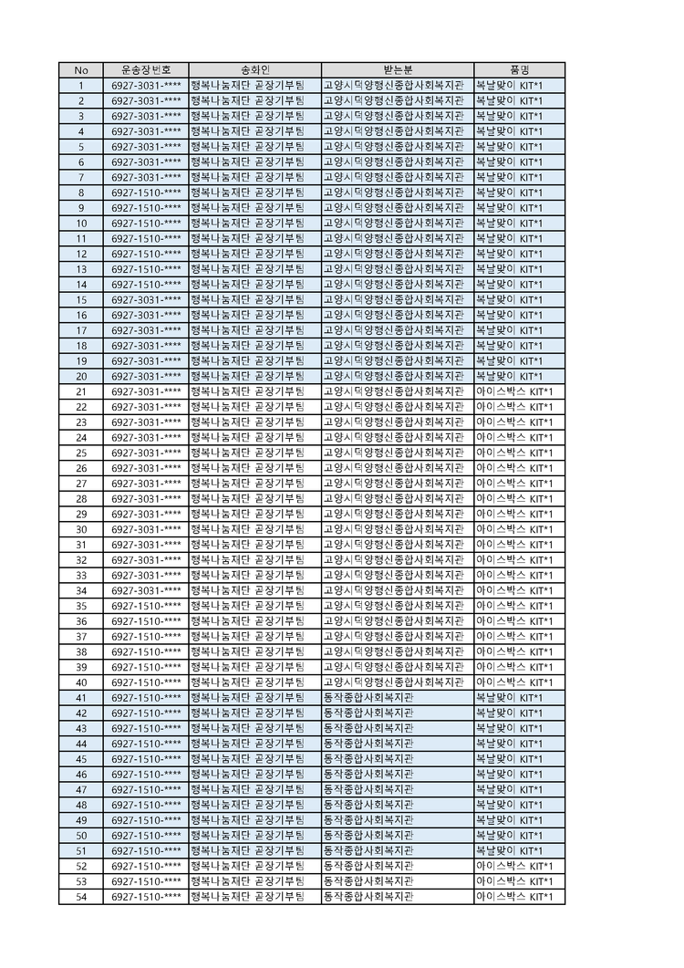 기부자님이 사용한 기부포인트 59,800원, 결제 수수료 150,345원, 기타 사업비는 행복나눔재단이 부담했습니다. (기부후기 발송시점에 최종 업데이트 됩니다.) 실제 쇼핑몰에서 확인되는 배송현황을 캡처한 내용입니다. 실시간 자료와는 차이가 있을 수 있습니다.